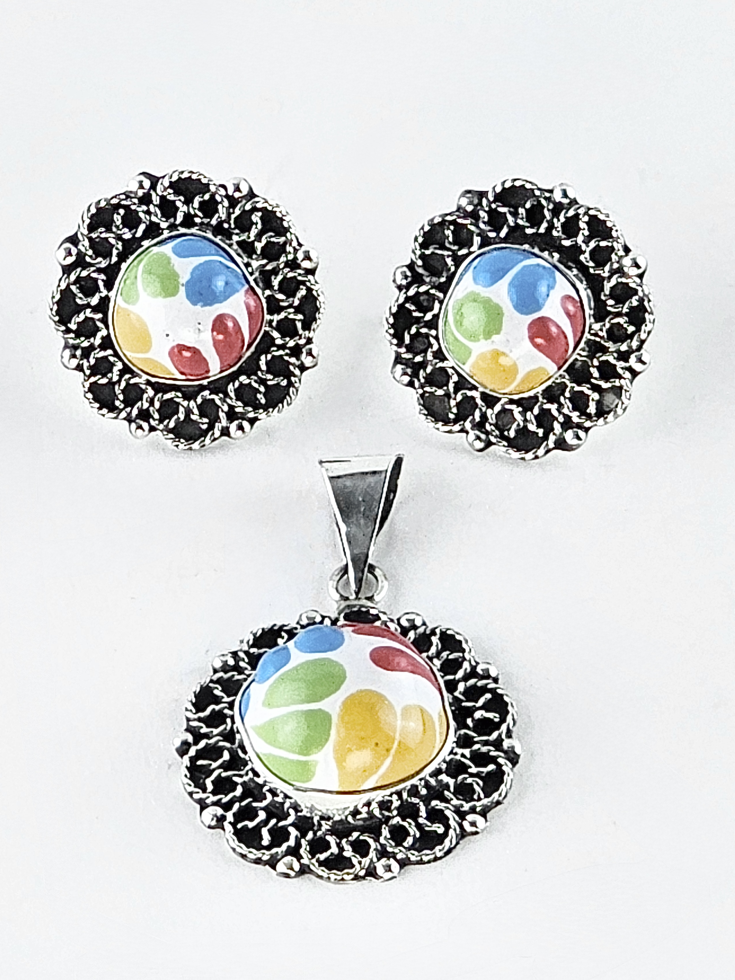 handmade 925 silver set with talavera in colors white, yellow, green and red